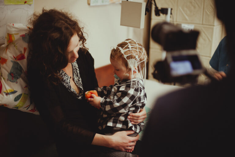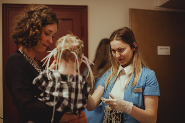 Children from the first weeks of life to 6 years of age (and in some cases also older) we perform an EEG while sleeping – at night (around 8:00 PM) or during a day-nap. Why during sleep? Because at this stage of development – the nervous system is very differentiated, and EEG in sleep is the most in-depth diagnosis of brain activity abnormalities. This form of examination is recommended, especially in the case of disturbing symptoms appearing at night or in the morning (waking up, night anxiety, bed wetting, convulsions), as well as when the usual EEG test in wakefulness raises doubts.